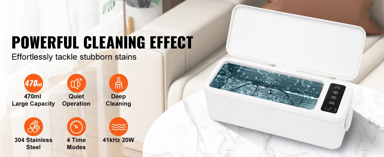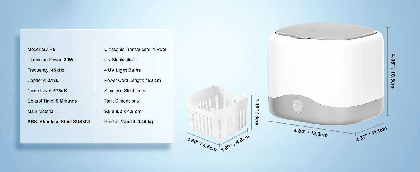 Versatile Applications: Four modes are provided (glasses mode: 180s, jewelry mode: 240s, watch mode: 300s, other mode: 360s). The ultrasonic cleaner has a wide range of applications, from glasses (non-coated), office supplies, toothbrushes, makeup brushes, jewelry, metal/ceramic utensils, dentures to watches. Whether you're a household user or a professional, it meets the cleaning needs of various items.